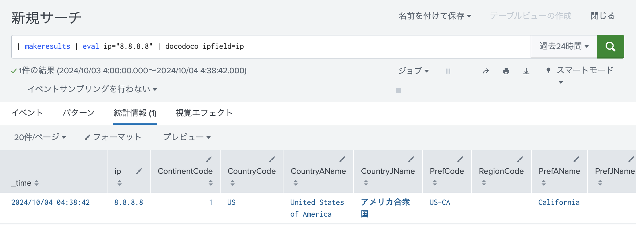 | makeresults | eval ip="8.8.8.8" | docodoco ipfield=ip