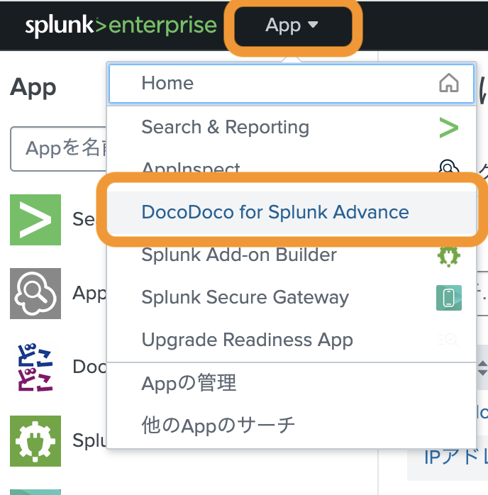 まず、Splunk 管理画面の上部にある「App」をクリックし、「DocoDoco for Splunk Advance」を選択します。